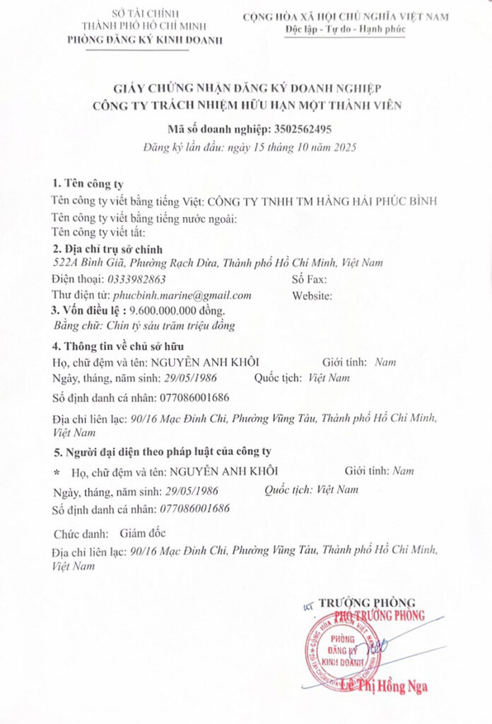 | Địa chỉ Thuế | 522A Bình Giã, Phường Rạch Dừa, TP Hồ Chí Minh, Việt Nam |